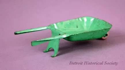 Toy wheelbarrow, made of stamped steel, painted light green. Has two handles and one rubber tire.