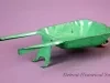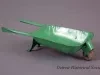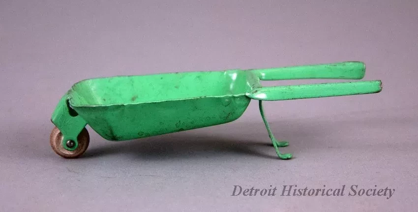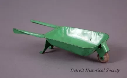 Request ImageToy wheelbarrow, made of stamped steel, painted light green. Has two handles and one rubber tire.