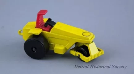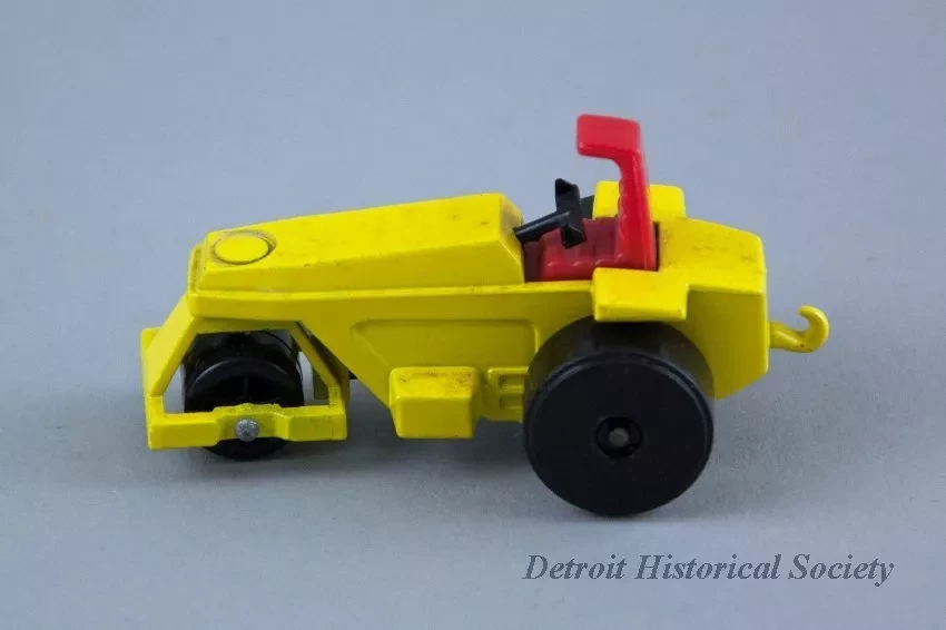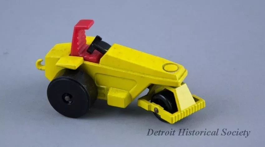 One toy pavement roller made of cast metal and plastic. It has a yellow body, red plastic seat and three wide black plastic wheels. The front wheel turns with a steering lever. Marked: "Matchbox Superfast No. 21 Rod Roller, c. 1973 Lesney Prod. & Co. Ltd., Made in England"