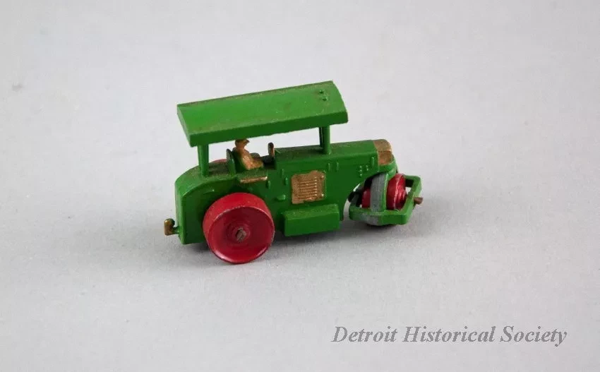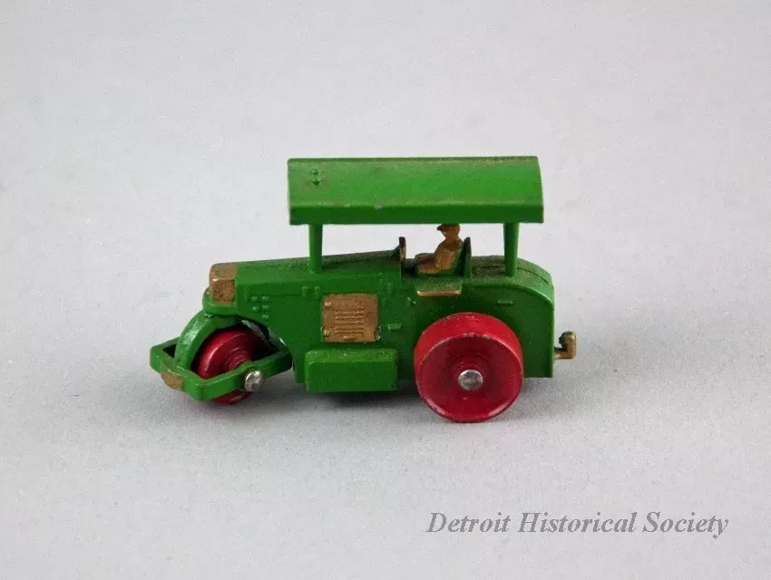 One toy pavement roller made of cast metal. It has a green body with red wheels, gold trim, and a tan driver. A green canopy is mounted on 4 posts over the driver. The front wheel turns. Marked: "Lesney, England"