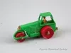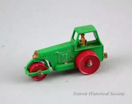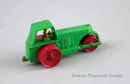 Request ImageOne toy pavement roller made of cast metal. It has a green body and cab with red wheels, gold-colored trim, and a tan driver. The front wheel turns. Mkd.: "Lesney, England"