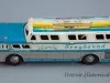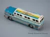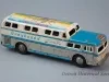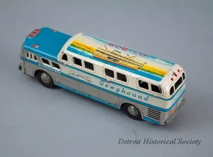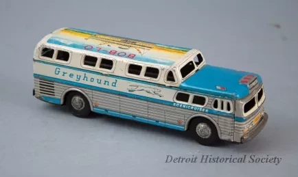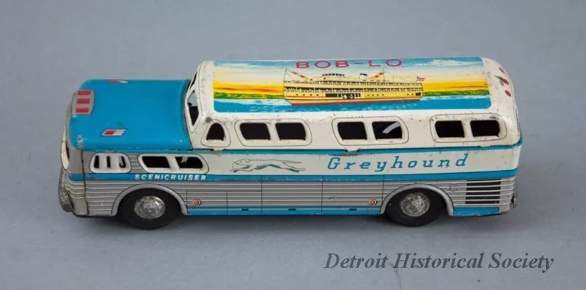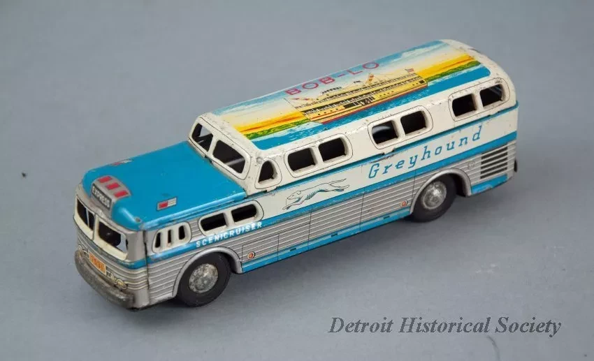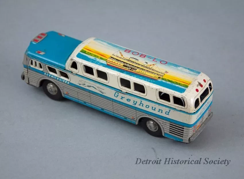 One toy "Greyhound Scenicruiser" bus. The toy is made of several pieces of thin steel that have been stamped and assembled to resemble a Greyhound bus. Four rubber/metal wheels are attached to the black underside. The upper portion of the exterior has been painted blue and white in the Greyhound style along with the company logo. The lower portion of the exterior is painted silver. The top of the bus has a multicolor drawing of a Bob-Lo passenger steamship underway on the Detroit River. Red text at the top of the drawing reads "Bob-Lo." Small printed text near the right rear wheel reads "Made in Japan."