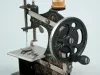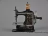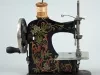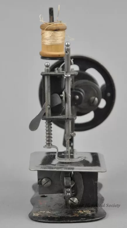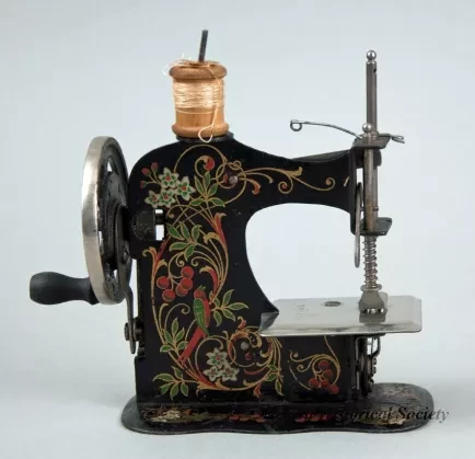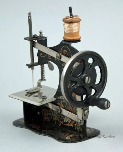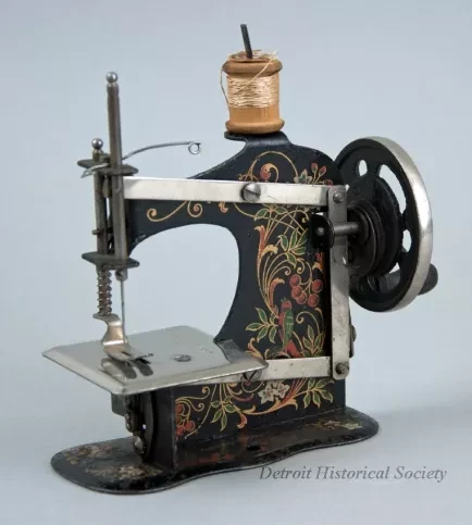 Toy sewing machine: Made of tin and painted black. Has gilt, green, and red stencilled designs of scroll leaves, birds, cherries, and flowers. Operated by hand wheel on side. Marked "#53468" on needle plate and "Made in Germany" on base. Has holes through base for anchoring to table.