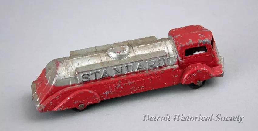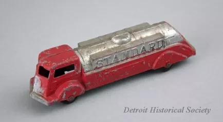 Toy tanker truck made of cast metal. Painted red and silver. "Standard" shown in raised letters on sides. No manufacturer's marks.
