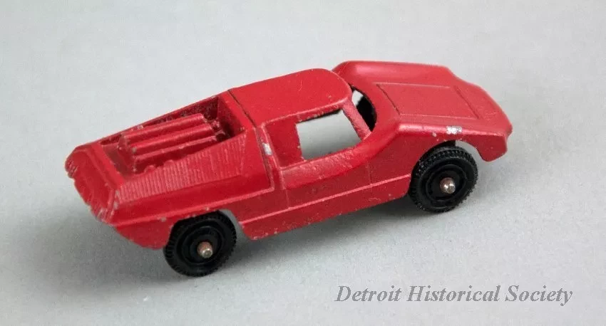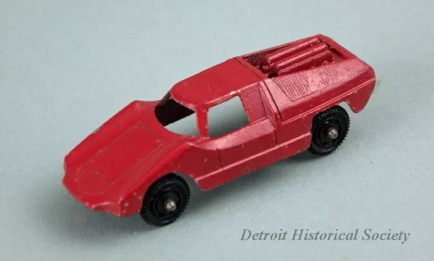 Toy car made of cast metal. Painted red. Racing/sports car style with sloped front end and exposed engine at back. Marked: "Tootsie Toy, USA, Flat ABARTH -2"