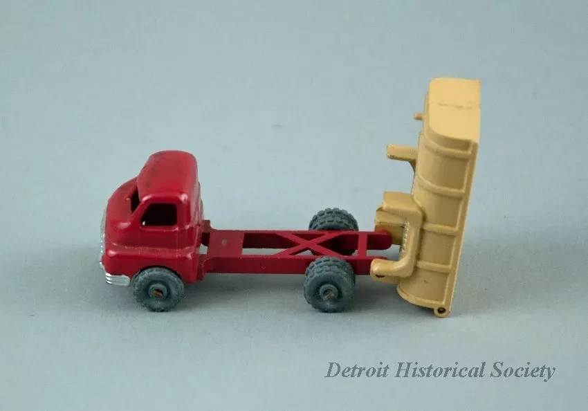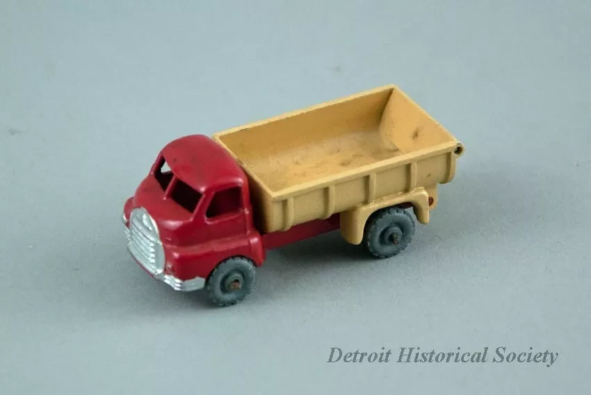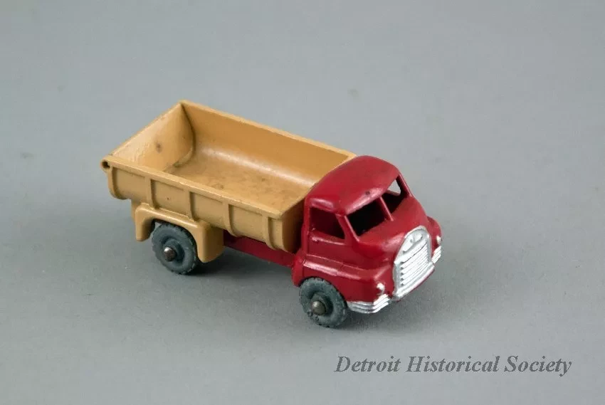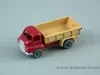 One toy dump truck made of cast metal. It has a red cab with a silver-colored radiator, and a tan dump box with double wheels on the back axle. The rear gate swings open and the box tips up for dumping. Marked: Bedford 7 ton tipper, Made in England by Lesney".