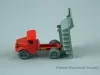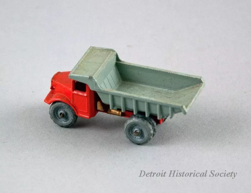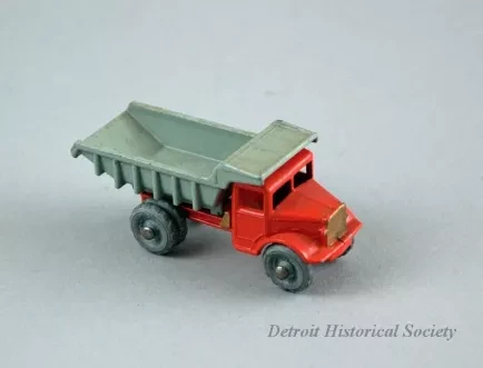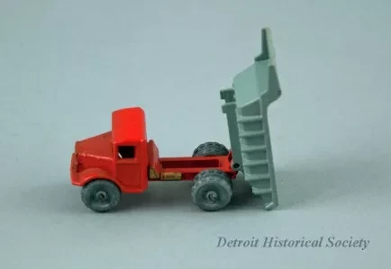 One toy dump truck made of cast metal. It has a red/orange cab and a gray dump box with a canopy section over the cab. The front axle has two tires and the rear axle has four tires. Marked: "Lesney England"