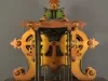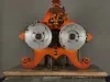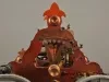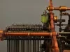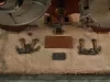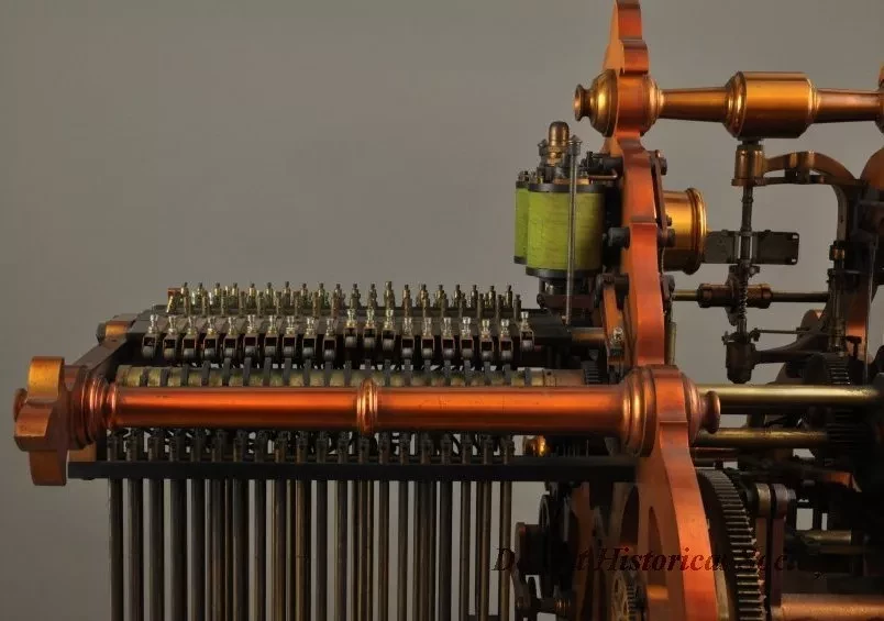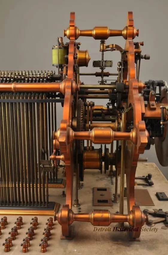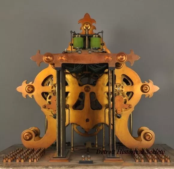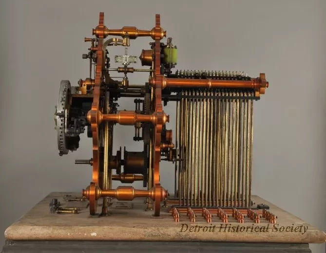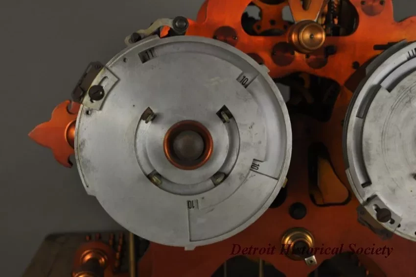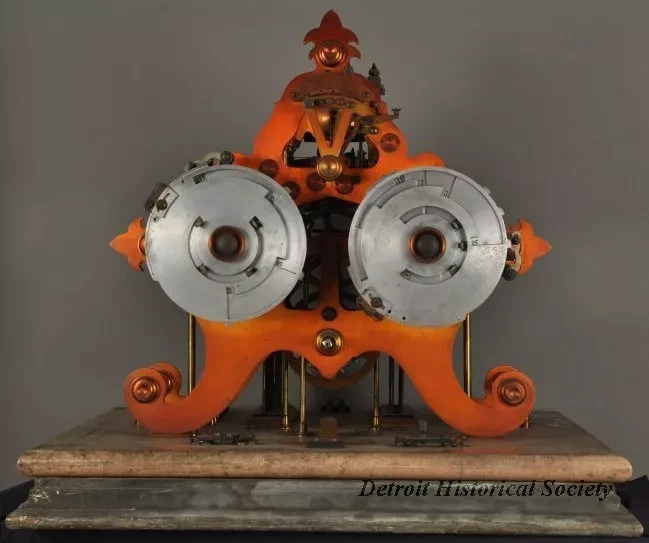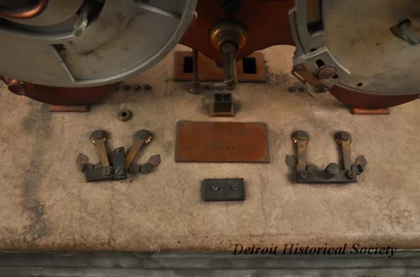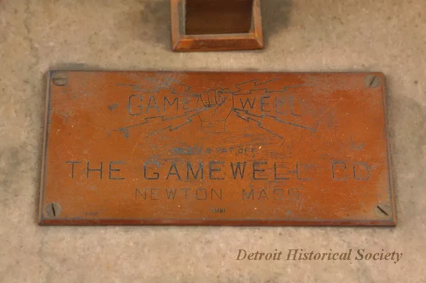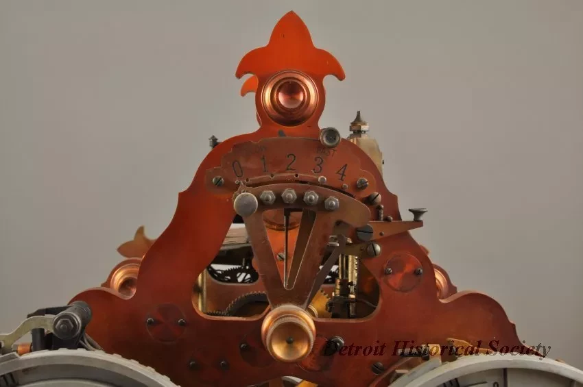 Fire alarm transmitter. A copper-colored metal Gamewell fire alarm transmitter on a marble base. The front controls consist of two large central numbered dials, a "speed" switch numbered from 0 to 4 above, and a pair of switches at its base. An array of gears are enclosed between two ornamented roughly pentagonal end pieces. A pair of electromagnets and two rows of vertical metal columns extend from the transmitter's rear. The rear of the base is also covered with several rows of terminals. Brass plate reads: "Game Well, U.S. Patent Off., The Game Well Co., Newton Mass".