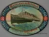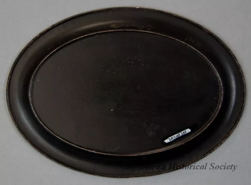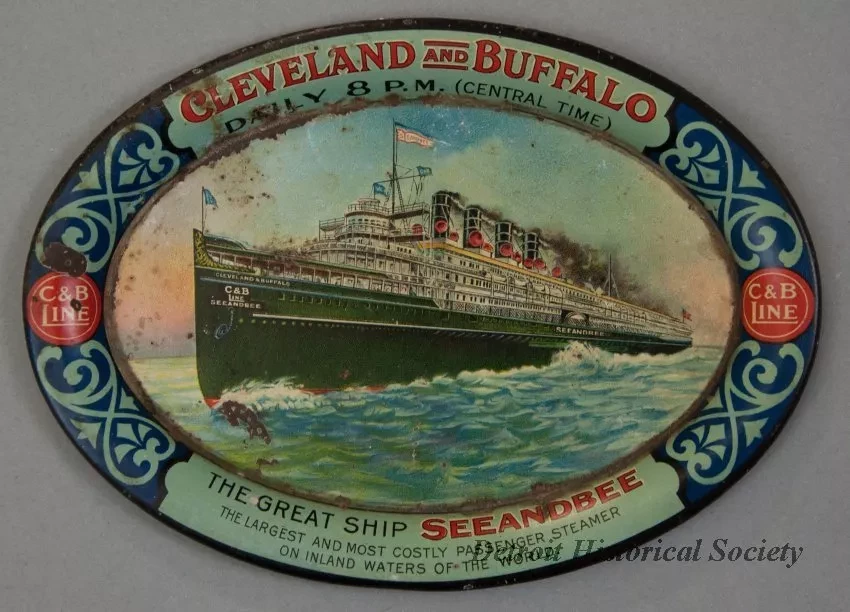 One tip tray from the passenger steamship, SS Seeandbee, of the Cleveland and Buffalo Transit Company. The oval-shaped tray is made of thin stamped steel. It has narrow convex curved sides and a flat bottom. The sides have a decorative blue/green painted designs with red and black text that reads "Cleveland and Buffalo, Daily 8 P.M. (Central Time)" and "The Great Ship Seeandbee, The Largest and Most Costly Passenger Steamer on Inland Waters of the World." The tray bottom has a multi-color, port side bow view of the steamship which is underway in fair weather. No manufacturer's name or marks are shown.