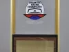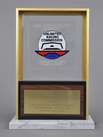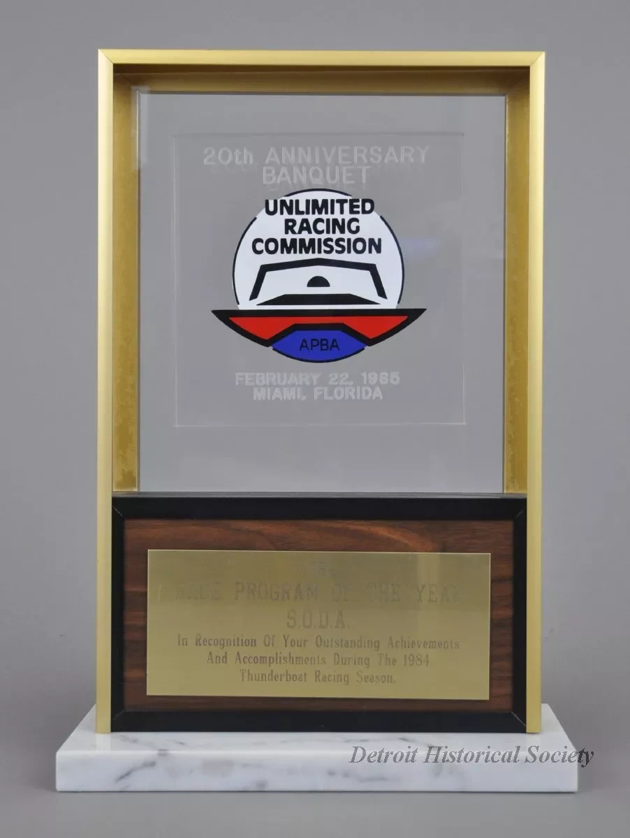 One hydroplane Racing Commission trophy. The rectangular-shaped trophy has a glass top, metal bottom, gold-colored aluminum frame, and a marble base. The glass top has a red, white, blue, and black hydroplane emblem with text that shows "Unlimited Racing Commission." Adjacent engraved text shows "20th Anniversary Banquet" and "February 22, 1985, Miami, Florida." A gold-colored metal plate on the bottom of the trophy has engraved text that shows "1984, Race Program of the Year, S.O.D.A. In recognition of your outstanding accomplishments during the 1984 Thunderboat racing season." An adhesive label on the underside of the marble base shows "Scott's Trophy Co., 30 Years of Service, 1954-1984, Seattle, WA."