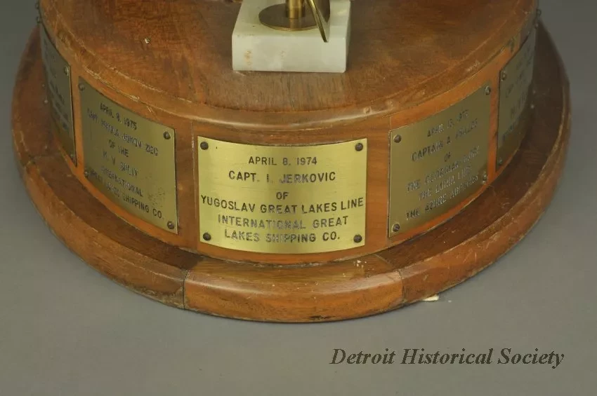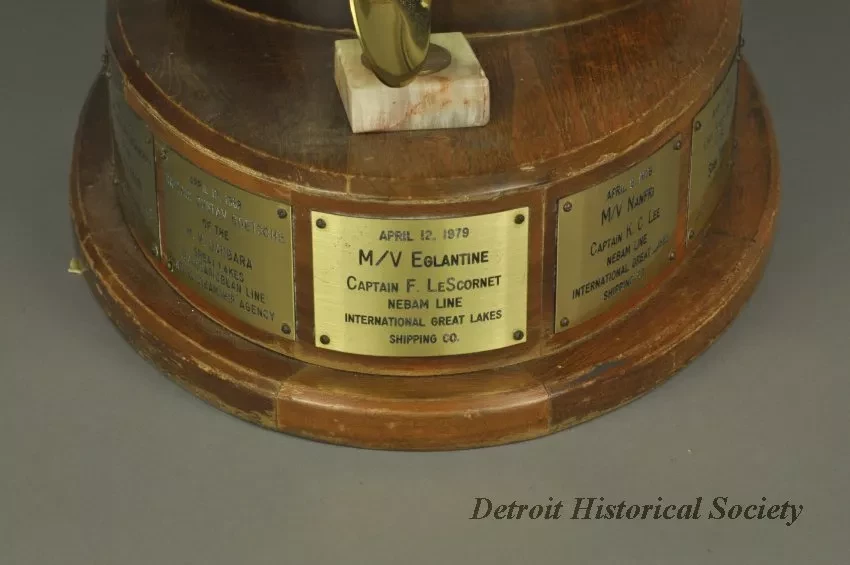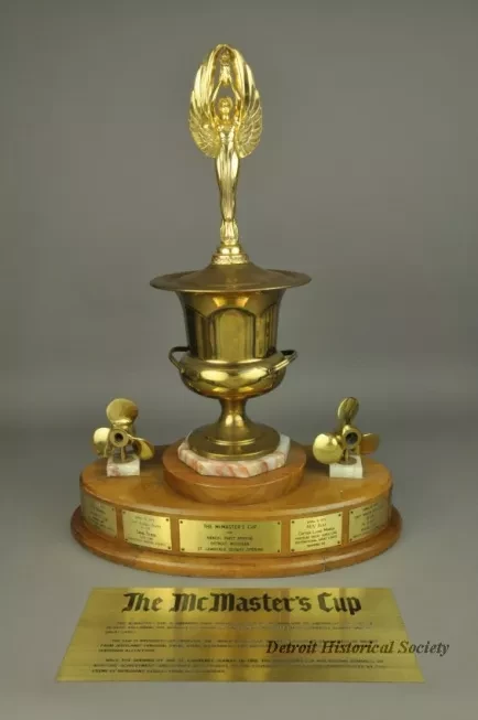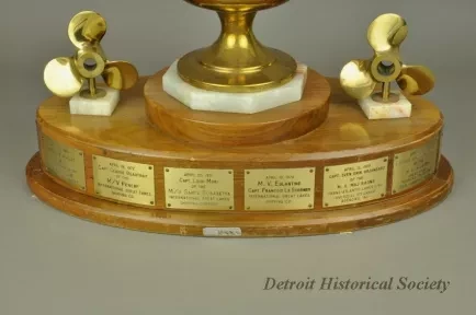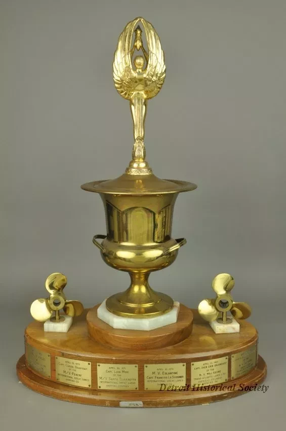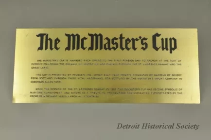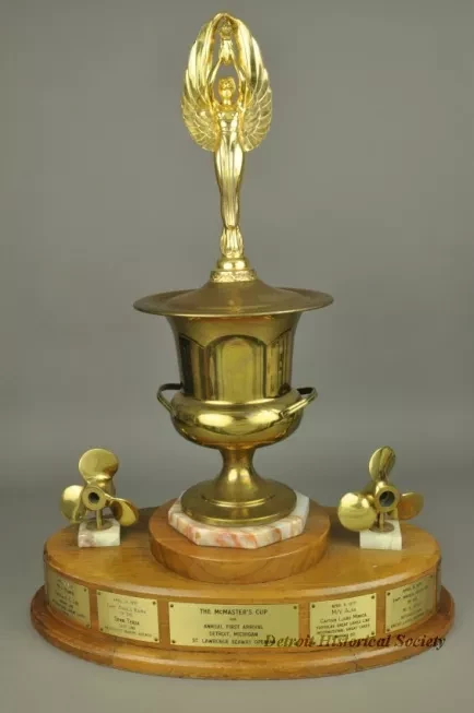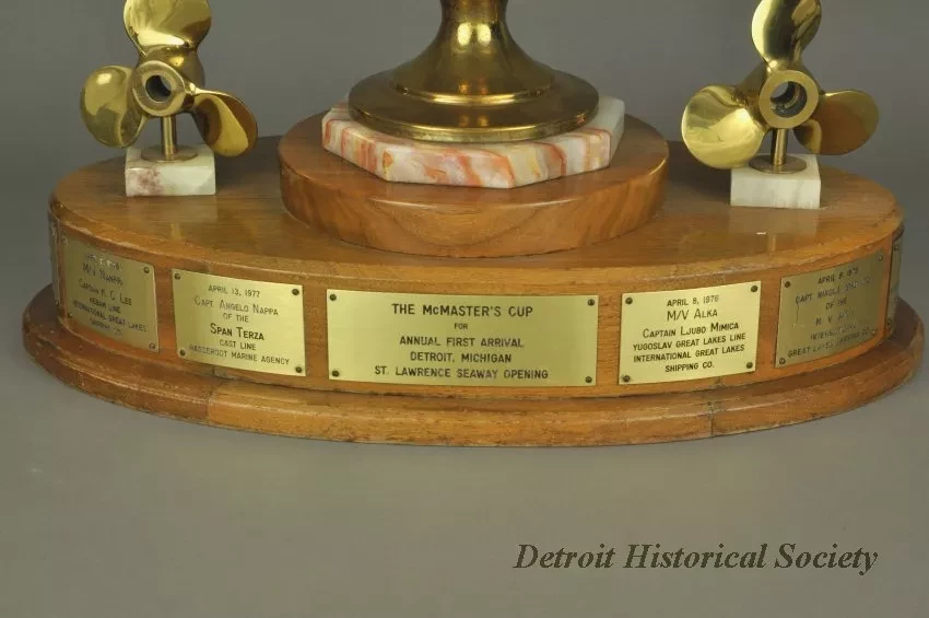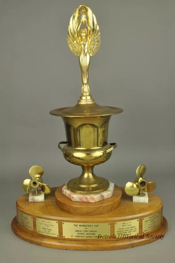One trophy for "The McMaster's Cup." The trophy has an oval-shaped, 3-tiered, varnished walnut base with engraved brass plates attached along the perimeter of the center tier. An octagonal-shaped, polished marble slab is mounted on the top tier and a large brass trophy cup is mounted on top of the marble. The top of the cup has a winged female figure that is holding a torch in her upraised hands. Small brass ship propellers are mounted on top of the center tier of the walnut base on either side of the cup. The center engraved brass plate shows "The McMaster's Cup for Annual First Arrival, Detroit, Michigan, St. Lawrence Seaway Opening." Adjacent plates commemorate the date, ship name, captain's name, and shipping company name for the first foreign ship to arrive at the Port of Detroit in the Spring of the year. The engraved plates cover the years 1968 through 1979. A separate large engraved brass plate gives more details about the history of the Cup.