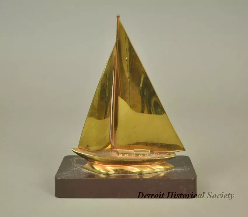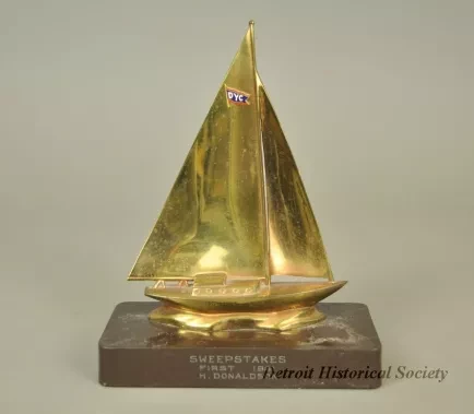 One sailboat race trophy. The trophy consists of a brass casting that shows a starboard side view of a fractional rig sloop under sail. The red, white, and blue burgee of the "DYC [Detroit Yacht Club]" is shown near the top of the mainsail. The casting is mounted on a dark brown rectangular Bakelite base. The front face of the based is engraved with text that shows "Sweepstakes, First, 1951, H. Donaldson." The underside of the base is covered with red felt.