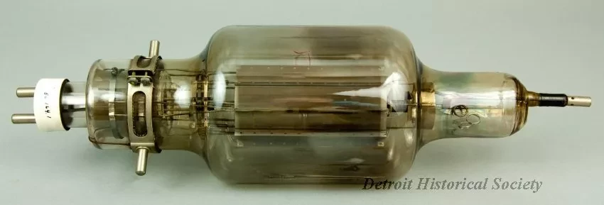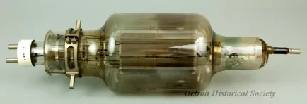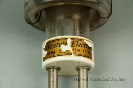 Western Electric vacuum tube, part # 379-A. Filamentary, air-cooled triode amplifies power for radio transmission. The tube is made from glass with metal wiring and other parts in the center extending through the body.