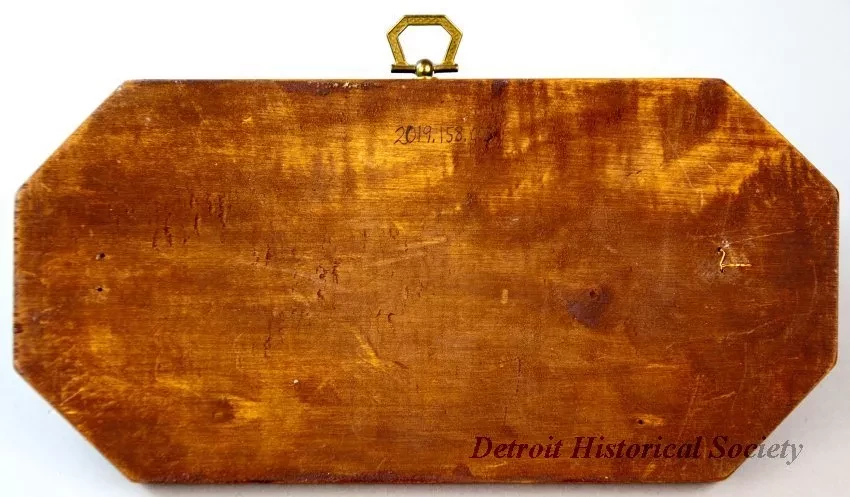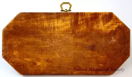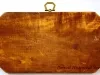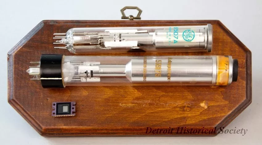 The tubes and chip are mounted on a 3/4-inch thick wood display plaque that has decorative routered edges and has been finished with dark brown stain and a semi-gloss lacquer or varnish. The display shows the evolution of technology from the large vacuum tubes of the 1950's-1970's that were eventually replaced by the semiconductor image sensor chips of the 1980's.