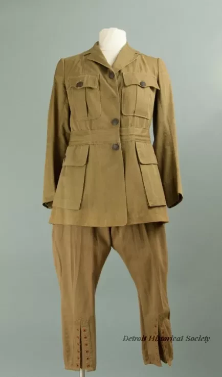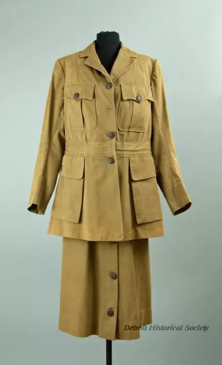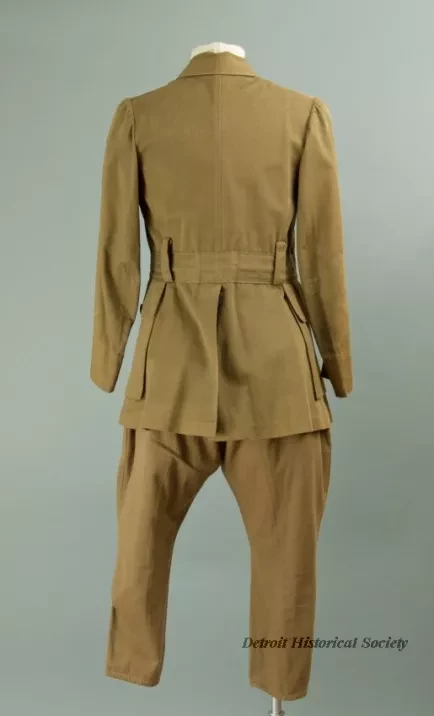 One National League for Women's Service Motor Corps uniform of World War I. The 3-piece uniform is made of a heavyweight cotton khaki gabardine fabric in a drab green color. The pieces include: