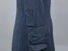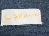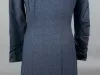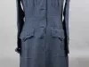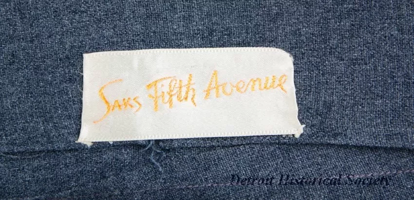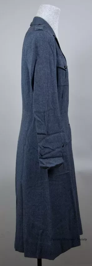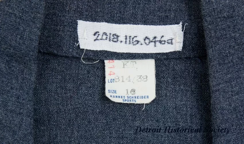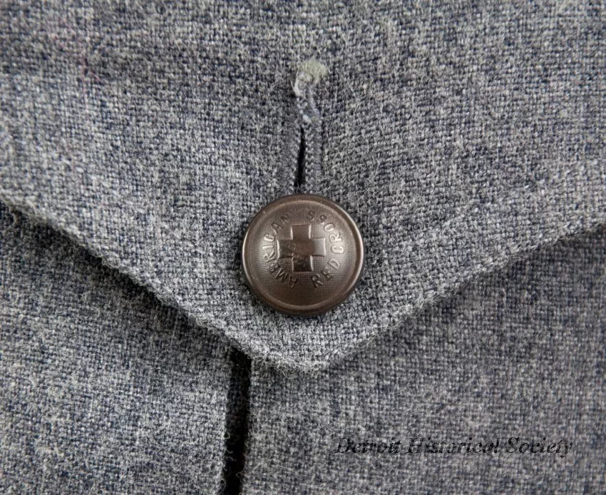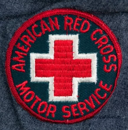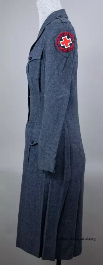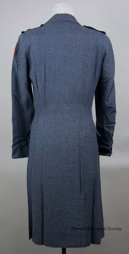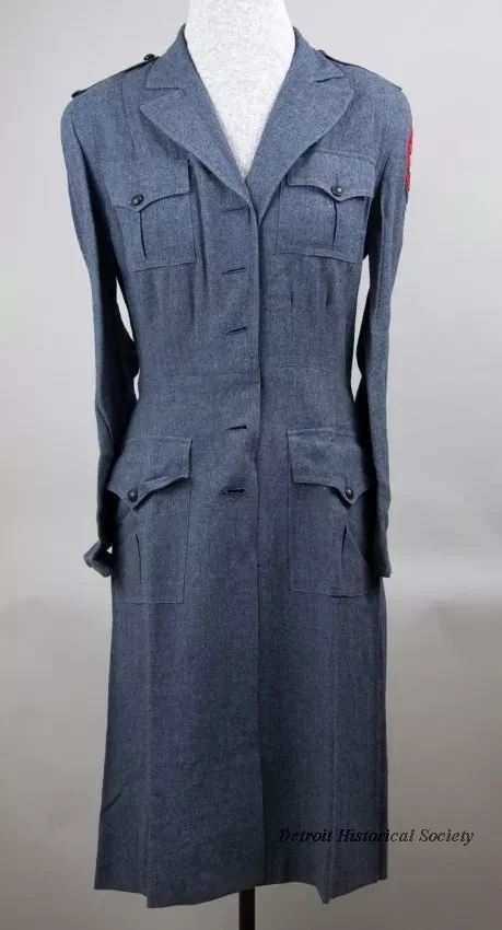 One woman's World War II "American Red Cross Motor Service" uniform. The uniform consists of a one-piece dress that is made of dark blue/gray wool. It has a pointed collar with short lapels, button epaulets on the shoulders, inside shoulder pads, five buttons down the center front, flap pockets with buttons on the left and right breasts, and flap pockets with buttons on the front of the skirt at the left and right sides. The plain skirt is slightly flared and has a hemline ending just below the knee. The left sleeve has a circular embroidered patch with a red/white cross at the center and red text along the perimeter that reads "American Red Cross Motor Service." A label on the inside back collar reads "KT, Lot 814/38, Size 16," and "Hannes Schneider Sports." A label on the inside right breast reads "Saks Fifth Avenue."