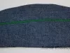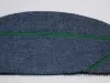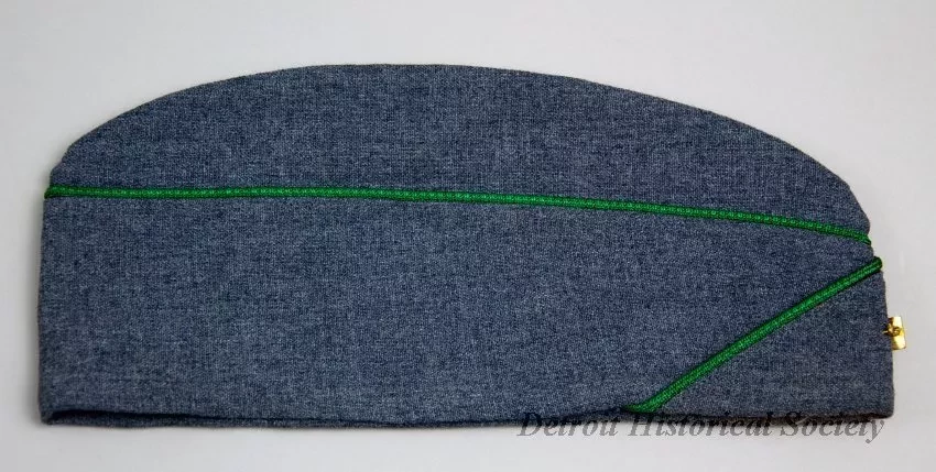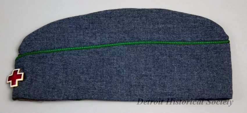 The uniform includes a folding side (garrison) cap that is made of the same wool fabric as the dress. It has green piping along the top edges of the side panels and a Red Cross metal pin at the front. The interior has a faded blue grosgrain ribbon headband and a faded blue satin/rayon lining. A label on the inside top of the cap reads "Saks Fifth Avenue."