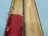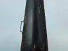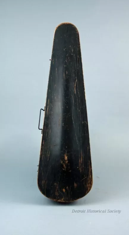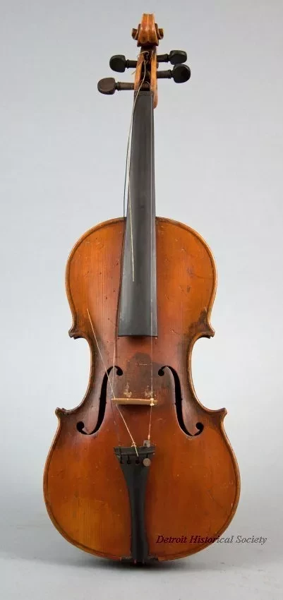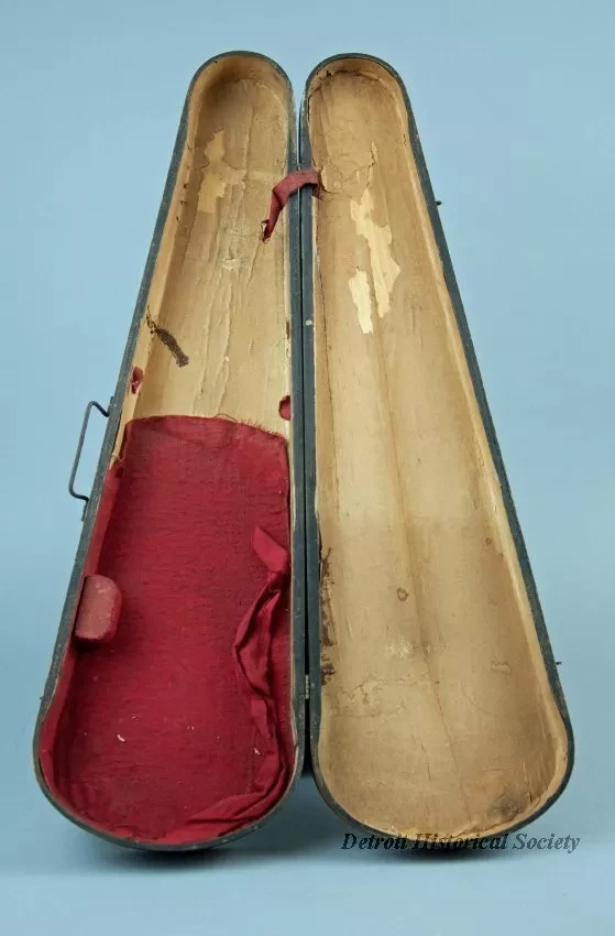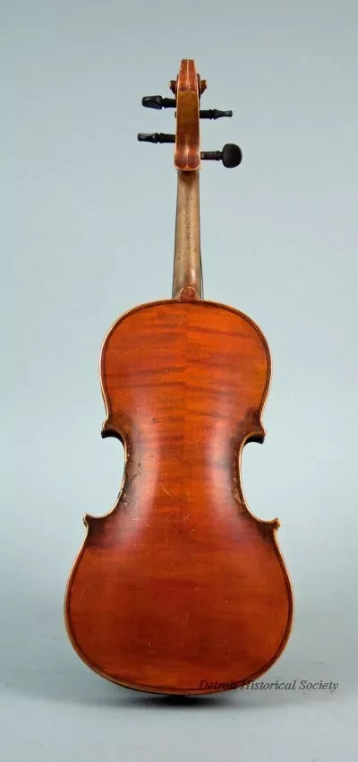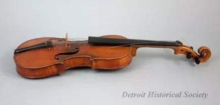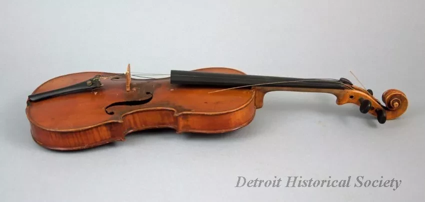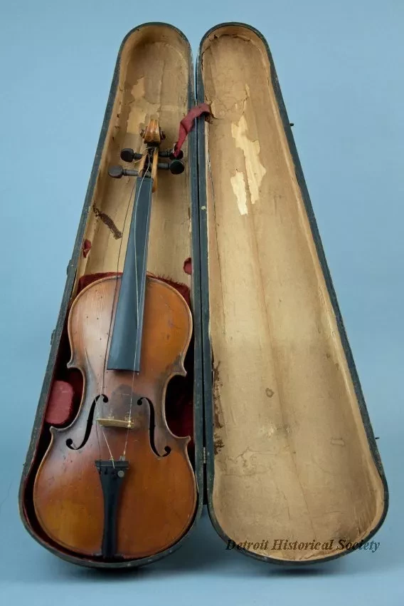One violin. The violin is made of fine-grained wood that has a reddish brown stain with a semi-gloss finish of clear lacquer or varnish. It has a short neck and appears to be less than full size. The instrument comes with a fitted wood case that has a hinged top, two metal hook/eye latches, and a rectangular metal handle. The interior is lined with brown paper and red felt and the exterior is painted black. Neither a bow nor a chin rest are included. No manufacturer's labels or marks are shown on either the violin or the case.