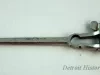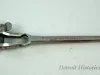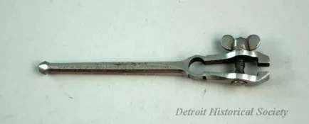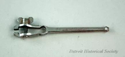 One watchmaker's hand vise. The jaws and handle of this tool were manufactured from a single piece of steel. The handle has an octagonal shape. Two short jaws at one end are tightened/loosened with a screw and wing nut. No manufacturer's name or marks are visible.