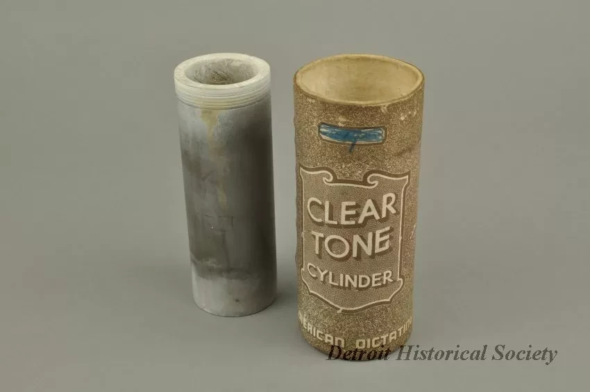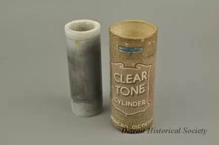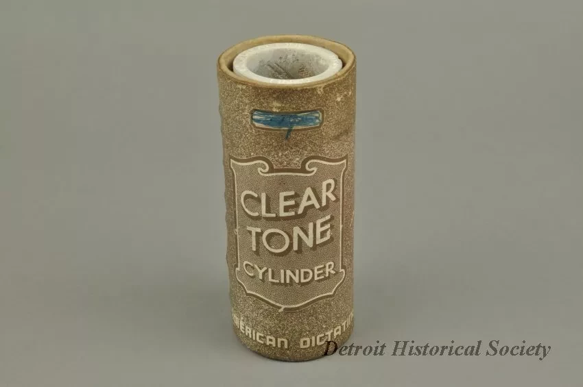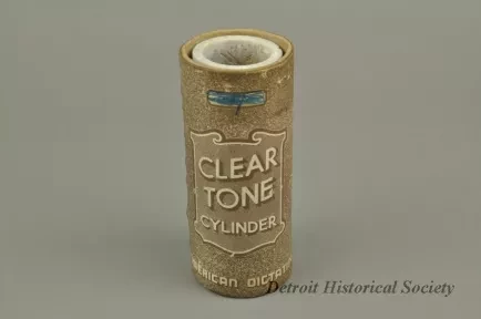 Clear Tone Cylinder. Wax cylinder is stored within the cardboard storage tube. It was made by the American Dictating Machine Co.