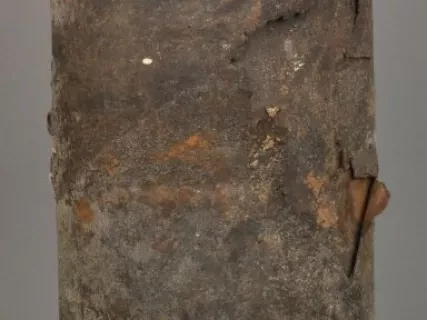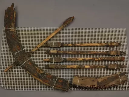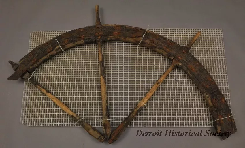 Partial ship's wheel: a portion of the outer rim and three spokes, stabilized on a grid shaped mounting. Recovered from the wreck of the early freighter EBER WARD, which sank in the straits of Mackinac on April 20, 1909, with five lives lost.