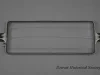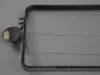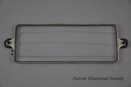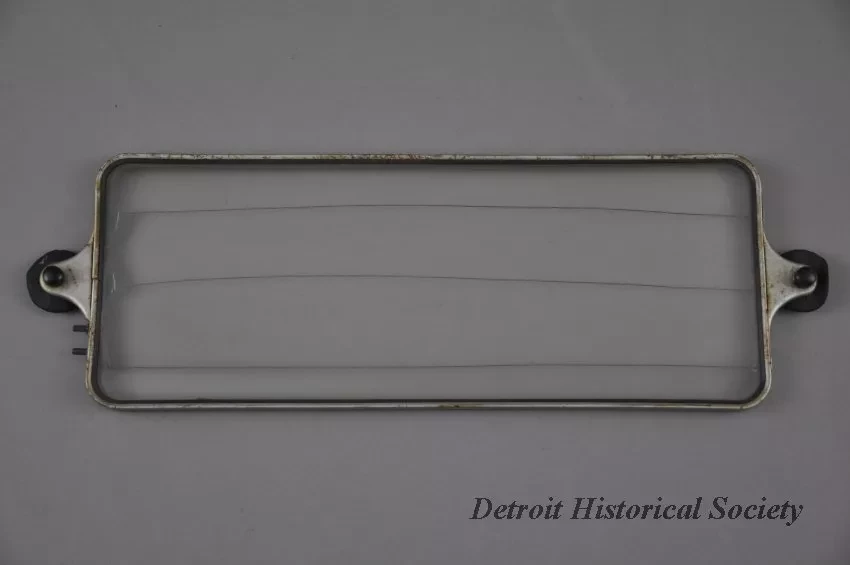 One removable rear window from an automobile. The small rectangular window is made of glass that has a zinc-plated steel frame. It has a black rubber seal on the inside edge of the frame. One black rubber suction cup is located at each end of the window for attachment to the vehicle body. Three copper wires run horizontally across the inside surface of the glass in order to defrost/defog the glass. Two metal electrodes are located near one corner of the metal frame for an electrical plug attachment. No manufacturer's name or marks are visible.