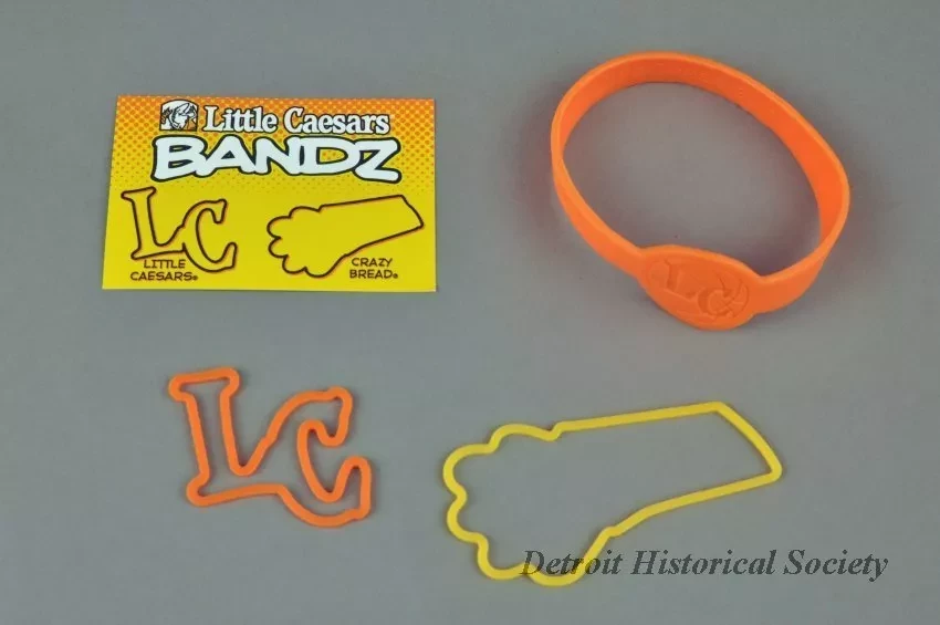 One "Little Caesars Bandz" wristband. The wristband is made of flexible orange plastic. It has a small disc at the center with embossed letters that show "LC." Embossed text along the outer surface of the wristband reads "Little Caesars ... a slam dunk!" A separate clear plastic packet contains two plastic design outlines and a small printed card that reads "Little Caesars Bandz, Collect All 4 Designs."