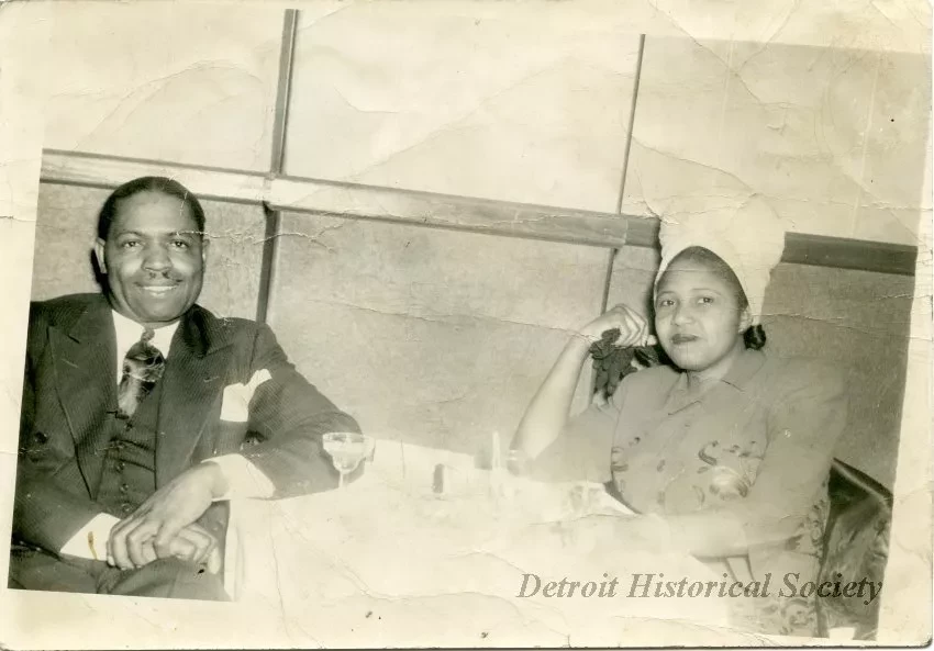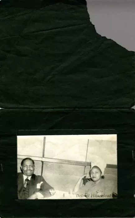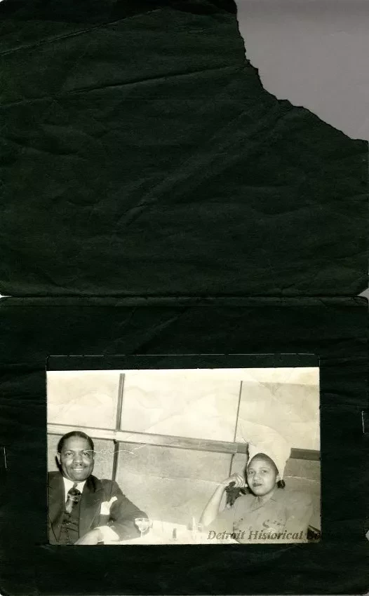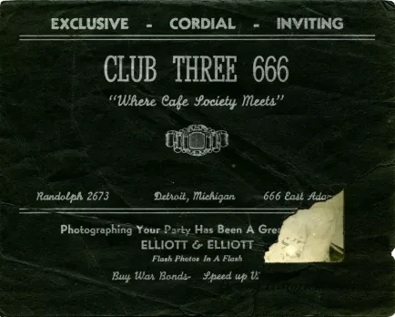 One souvenir photograph card from "Club Three 666" located at 666 E. Adams Street in Detroit. The bi-fold card is printed in silver-colored text on black heavyweight paper. Printed text advertises "Exclusive - Cordial - Inviting, Club Three 666, 'Where Cafe Society Meets'." Additional printed text along the lower edge reads "Photographing Your Party Has Been A Great Pleasure, Elliott & Elliott," as well as "Flash Photos In A Flash," and "Buy War Bonds, Speed up Victory." A large framed photo of a well-dressed, unidentified African-American couple, who are seated in the cafe, is shown inside the card. Small printed text on the back cover reads "For Extra Copies Write To Elliott & Elliott, 11557 Hawthorne Ave., Detroit, Mich. Tel. TO.6-7535, Ask for No. _____ ."