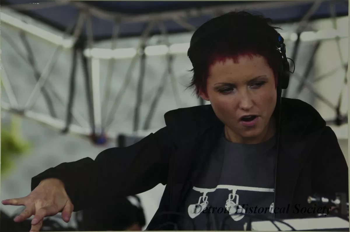 Request ImageOne digital image from a color photograph that was taken at the first Detroit Electronic Music Festival (DEMF) in 2000, showing a close-up of Magda D.J.ing on stage