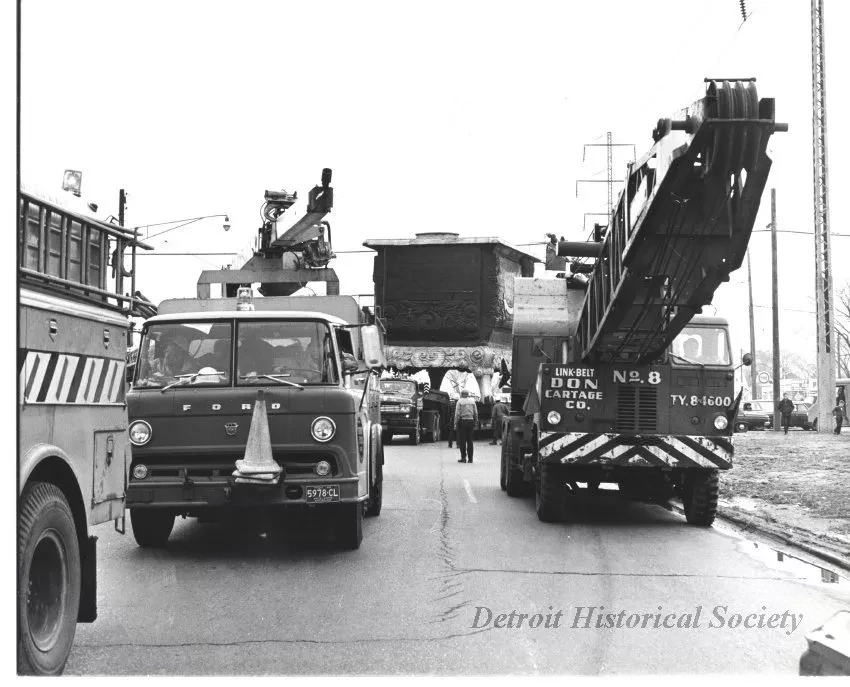 Digital scan of a black and white photo of the trailer carrying the World's Largest Stove proceeding west on Eight Mile Road, near Conant Street, during its move from near the Belle Isle Bridge to the State Fair Grounds on April 11, 1965. Two utility trucks, and a Don Cartage Company crane are in the foreground, driving ahead of the stove. The Market Tire Company is in the background on the left.