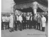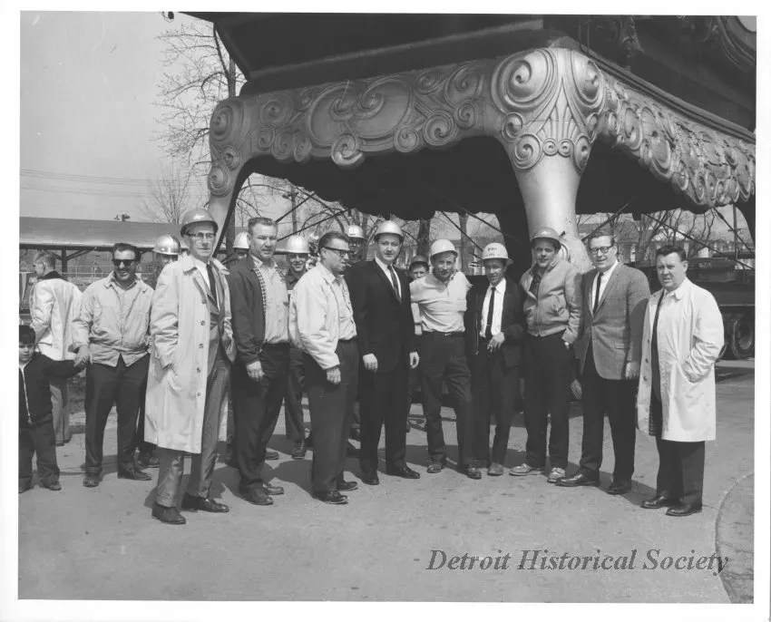 Digital scan of a black and white photo of a group of men, several in hardhats, posed around the base of the World's Largest Stove atop a truck trailer at the spot where it is to be installed at the State Fair Grounds. A Department of Street Railways shelter is in the background.