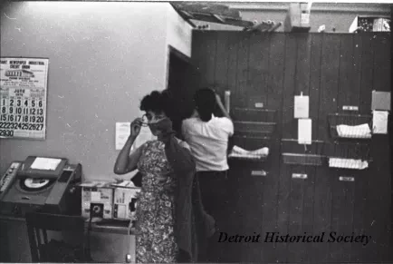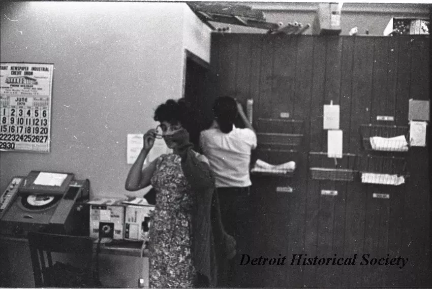 Digital image produced from a scan of a black and white negative of a two workers in the offices of the Michigan Chronicle. In the foreground a woman stands, adjusting her glasses, with a swear worn on one arm. In the background a a stands facing some bins along the wall. A June 1970 calendar is posted on the wall on the right, above a headliner.