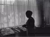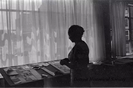 Digital image produced from a scan of a black and white negative of a worker in the offices of the Michigan Chronicle, standing beside a desk where page layouts are being pasted up. A document included with the scan identifies the woman as possibly being named Aretha Her body faces the desk, but her neck is turned so that she looks toward the camera. A window is in the background.