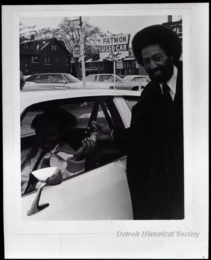 One black and white negative (and one photographic print) of WCHB disc jockey Fred Goree handing a teenage girl a set of car keys as she sits in a car. They are both smiling and looking at the camera. Three visible cars are seen in the background along with a sign that reads "Patmon Used Car Lot."