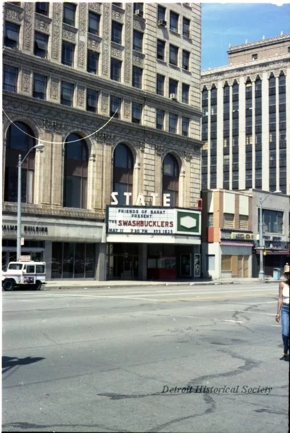 Negative and print color photo of the exterior of the State Theatre taken from the southeastern corner of Woodward Avenue and Elizabeth Street facing northwest. "Friends of Barat Present The Swashbucklers, May 11, 7:30 PM," is posted on the marquee. To the north of the theater are shuttered storefronts for the Ham Factory and an arcade. A woman crosses the street at the right edge of the frame.