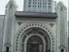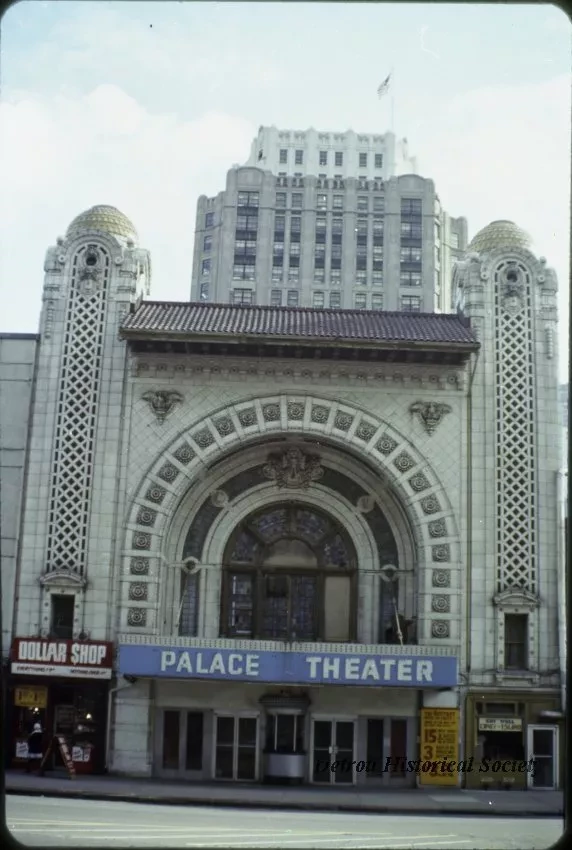 Color negative of the exterior of the shuttered Palace Theatre, as taken from across Monroe Street. A sign still hands beside the entrance advertising prices for X-rated films. The Dollar Shop is located to the left of the theater, and a Coney Island is on the right. The Water Board Building stands in the background.
