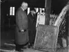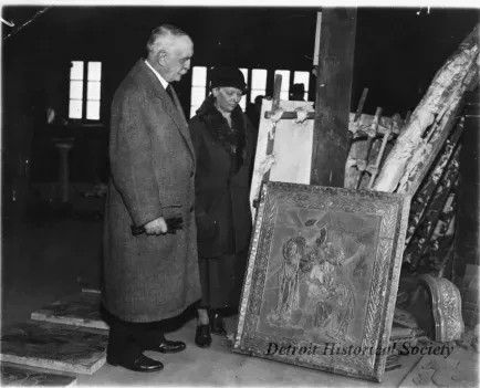 Monochromatic negative enlargement of a photo of a man and woman--possibly Mary Chase Perry Stratton and Horace James Caulkins admiring one of the Pewabic mosaics prepared for the Basilica of the National Shrine of the Immaculate Conception within the workshop of Pewabic Pottery. Several other of the mosaics themed around the Stations of the Cross lay on the floor behind them.