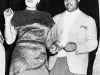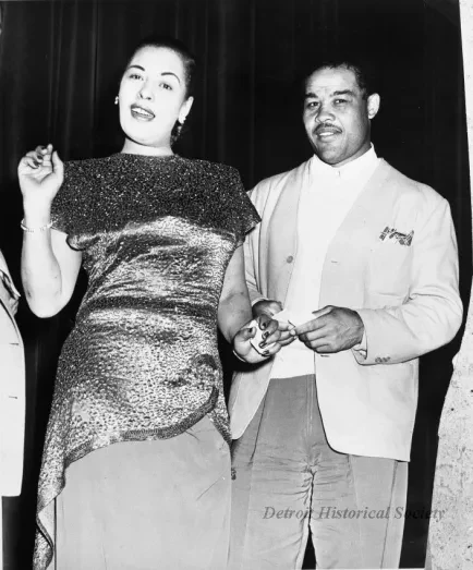 Black and white negative of a print which shows Joe Louis, and jazz singer, Billie Holiday. She is wearing a dress with a glittery top and he is wearing a light-colored sport coat with dark pants. A typewritten label beneath the lower edge of the image shows "Promoter Joe Louis, retired world's heavyweight [boxer], presents a pair of tickets to Billie Holiday on the stage of the Paradise Theatre."