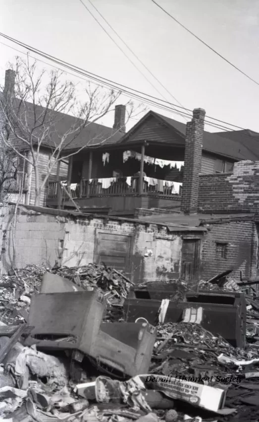 One black and white 35 mm negative image (and one photographic print) of a residential area in the Black Bottom neighborhood that was located east of downtown Detroit. The view shows a backyard and piles of trash/debris in the foreground. Two old 2-story wood frame houses and one 2-story brick structure with a 1-story shed can be seen in the background. Laundry is hanging from a clothesline and upper floor porch railing on the house in the center background.