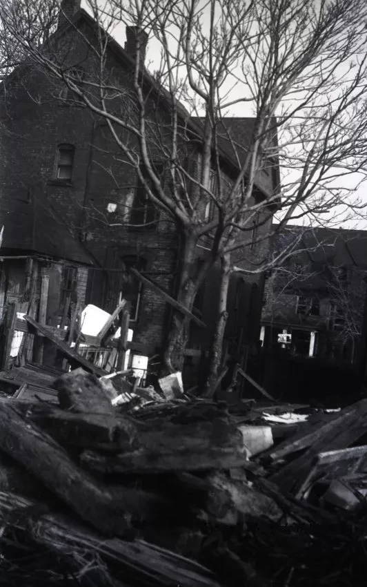 One black and white 35 mm negative image (and one photographic print) of a residential area in the Black Bottom neighborhood that was located east of downtown Detroit. The view shows a backyard and piles of trash/debris in the foreground. An old 3-story brick house and two trees can be seen in the left background. An old 3-story wood frame house can be seen in the far background at the right side of the photo.