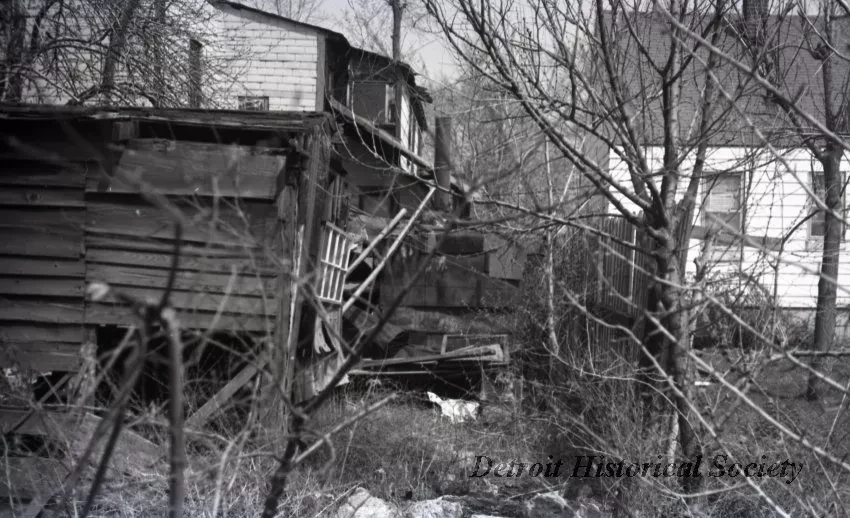 One black and white 35 mm negative image (and one photographic print) of a residential area in the Black Bottom neighborhood that was located east of downtown Detroit. The view shows a backyard that is overgrown with weeds/brush and has piles of debris on the ground. A dilapidated wood frame shed can be seen in the left foreground. Several dilapidated two-story brick and wood frame houses are visible in the left and right background.