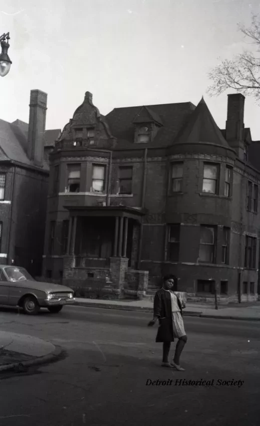 One black and white 35 mm negative image (and one photographic print) of a residential area in the Black Bottom neighborhood that was located east of downtown Detroit. The view shows a young African American woman, who is wearing a light-colored dress with a dark-colored coat, is posing for the camera as she walks across a street intersection. A car is stopped on the street in the left background. A 3-story brick mansion house can be seen in the center background. The side of a similar large mansion house can be seen at the left edge of the image.