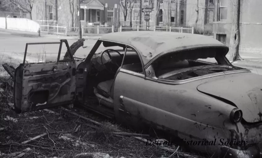 One black and white 35 mm negative image (and one photographic print) of a residential area in the Black Bottom neighborhood that was located east of downtown Detroit. The view shows a junk car that is parked on Dubois Street just south of East Congress Street. The street intersection, a street signpost, houses, and an apartment building can be seen in the background.