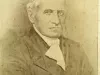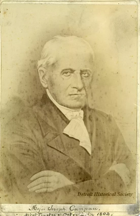 Cabinet card bearing a sepia-toned photograph of a painted head-and-shoulders portrait of Major Joseph Campau, with his arms folded, wearing a double-breasted, wide-lapelled suit "Major Joseph Campau, First Trustee of Detroit in 1802" is handwritten below. "Randall Photographer 220 Woodward Ave. Detroit, Mich" is printed on the verso.
