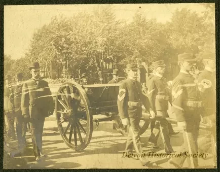 Cabinet card bearing a sepia-toned photograph taken of uniformed soldiers and men in dark suits and hats escorting a wagon carrying Hazen S. Pingree's casket during his funeral procession on July 6, 1901. The photo is mounted on a black card with an embossed border.
