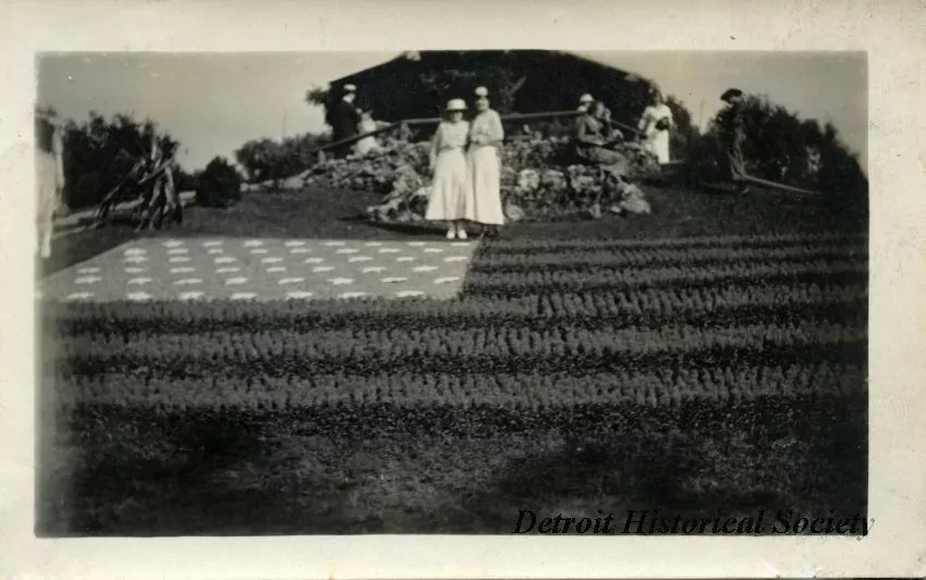 Black and white photographic print depicting two women posing above the floral American flag on the Cedar Mount at Belle Isle. Several more people are in the background.