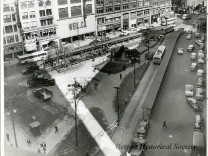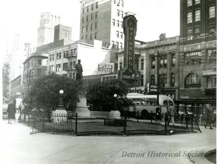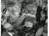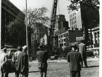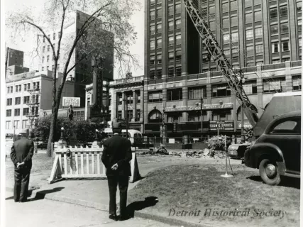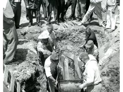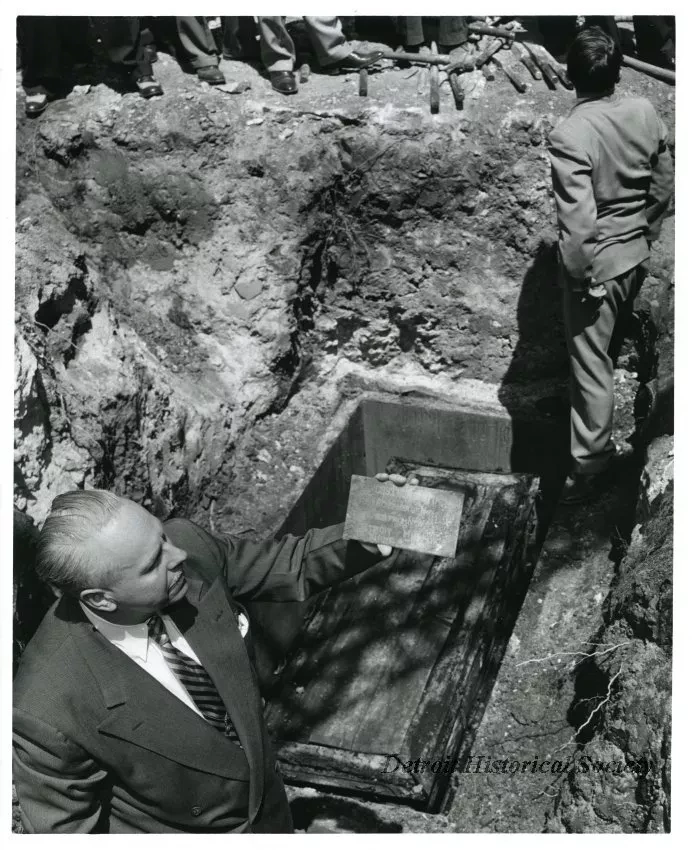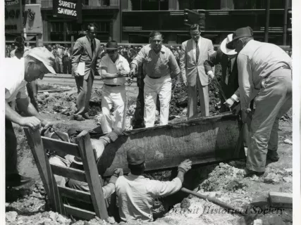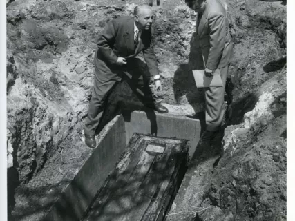 Black and white photograph (and 2 copies) of the disinterment of the casket of the first Governor of Michigan, Stevens T. Mason, in Capitol Park, Detroit, on June 1, 1955. Kent Sagendorph (left) of the Historical Society of Michigan is holding the silver nameplate from the casket. Robert E. Palmer (right) of the Detroit Historical Museum is standing on the edge of a concrete vault at the head of the casket. The casket was reburied at a new location in Capitol Park on December 5, 1955.