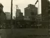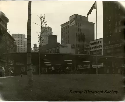 Black and white photograph of the Detroit Department of Street Railways (DSR) Capitol Park Bus Station, facing north from the lawn to the south of the station. On the Bus Station walls are route maps for Jefferson, Second, and Woodward Avenues. To the left along Shelby Street are the Farwell Building and Bamlet Building. To the right along Griswold Street are the Griswold Building, Surety Savings, and Friedberg's. In the background are the David Whitney Building, Broderick Tower and Union League Building.