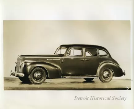 Request ImageSepia toned photographic print of a left side profile view of a black Packard 120 sedan. The photograph is marked with a number "3" on the bottom right corner.