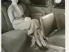Black and white photographic print of a shot of the rear interior of a Packard Motor Car Co. automobile, taken from the automobile's right side. There is a woman sitting in the rear seat and additional seating in the middle of the Packard is in place.